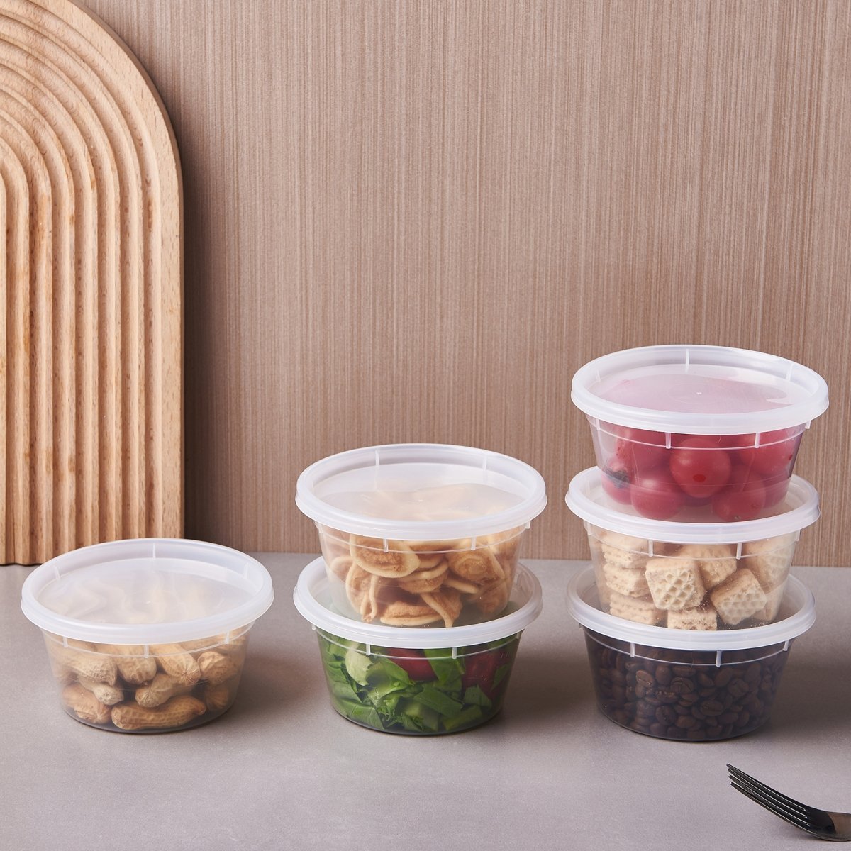 2. Available in 8oz,12oz, 16oz, and 32oz sizes, ideal for soups, sauces, noodles, fruit, snacks, and more. The uniform lid fits all sizes for convenient stacking and storage.