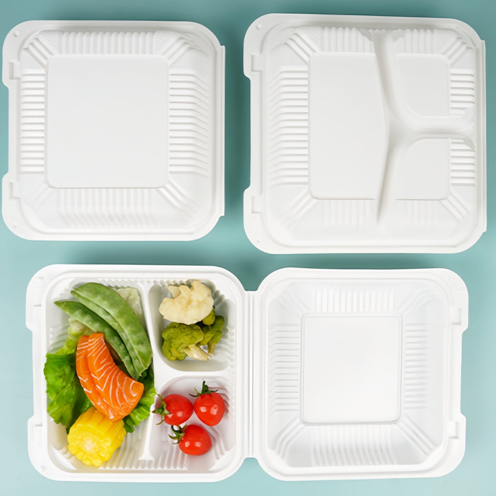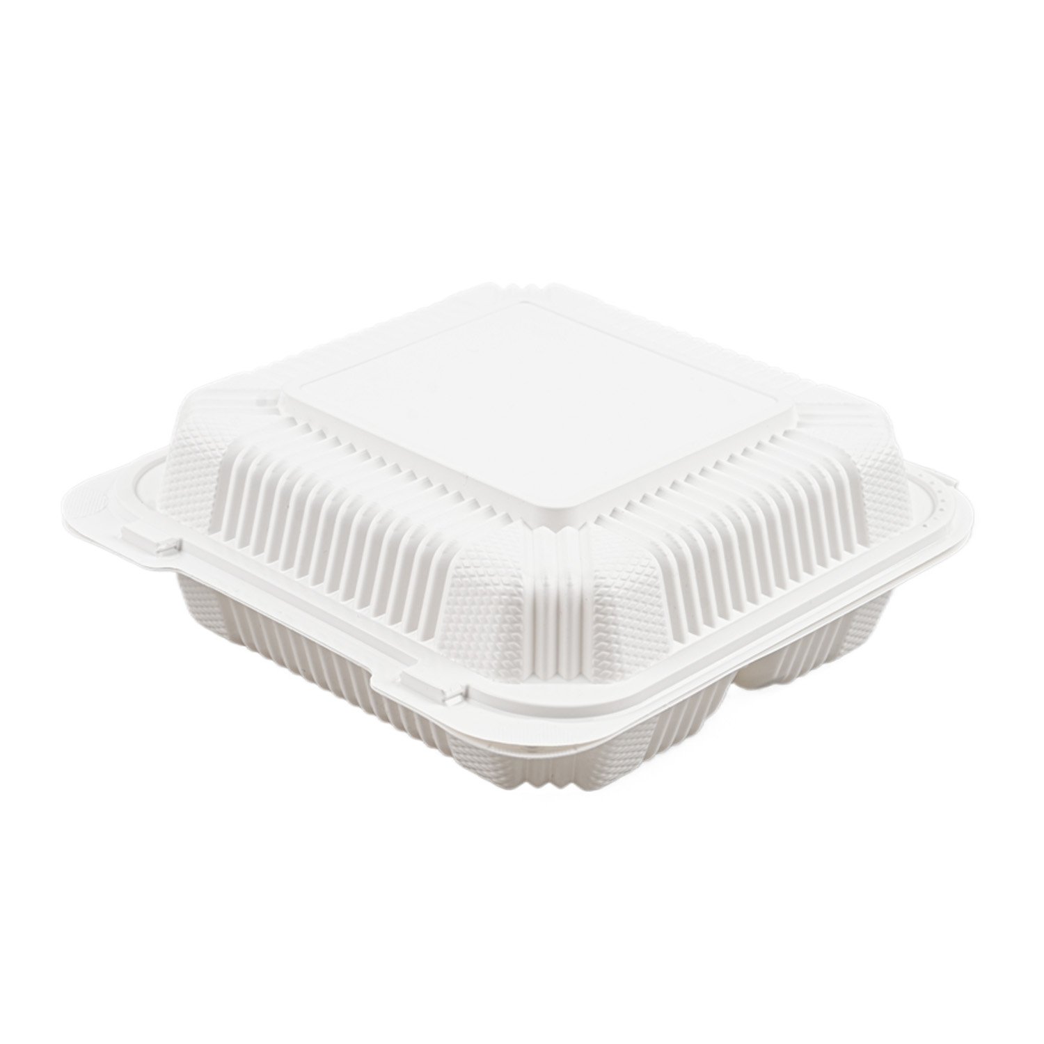 8×8 Inches 150PCS Disposable To Go Box Containers 3Compartments Takeout Food Trays Microwave Safe Hinged Lid Hybrid Polypropylene