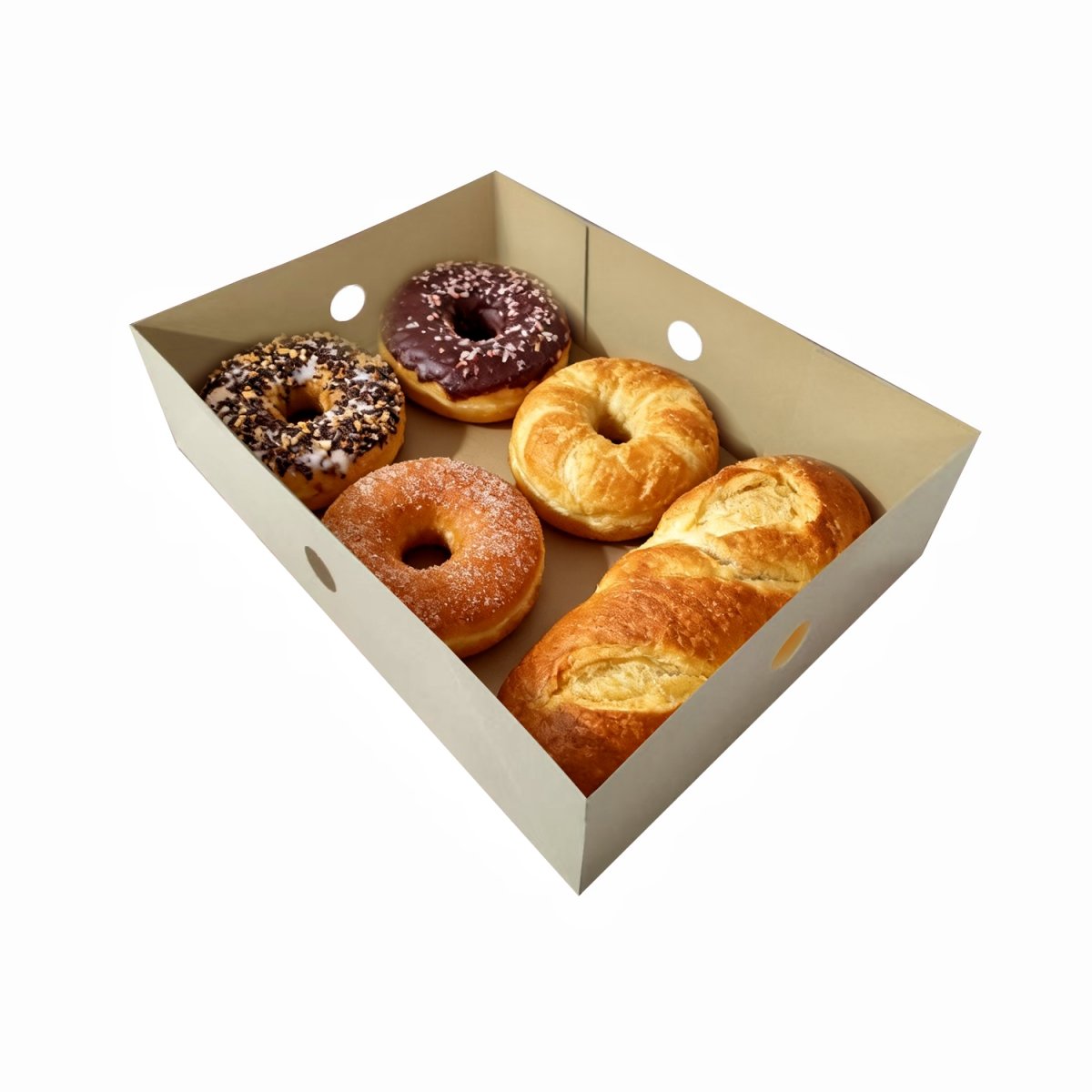 These kraft cardboard food trays offer a natural, rustic presentation for your food. Made from thick, recyclable paperboard, they are sturdy, grease-resistant, and stackable. Ideal for donuts, fruit, baked goods, sandwiches, or takeout, these trays add a clean and professional touch to food service—whether you’re a baker, café owner, or hosting an event.